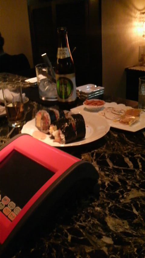 リアルな現場です! 高級な寿司に酒、ドレスのお姉さんに囲まれています。 ありがとうございます! 商談成立です♪
