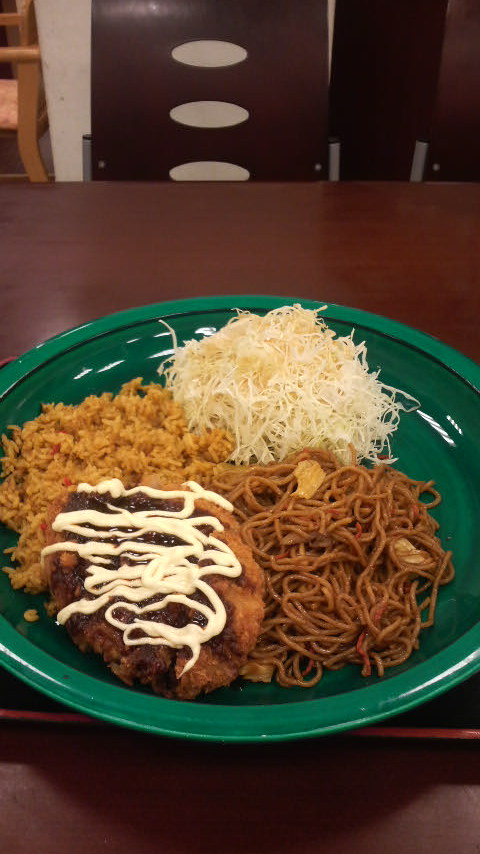 大きな丸皿にドライカレー・ソース焼きそば・豚カツ・キャベツがボリュームたっぷりです。